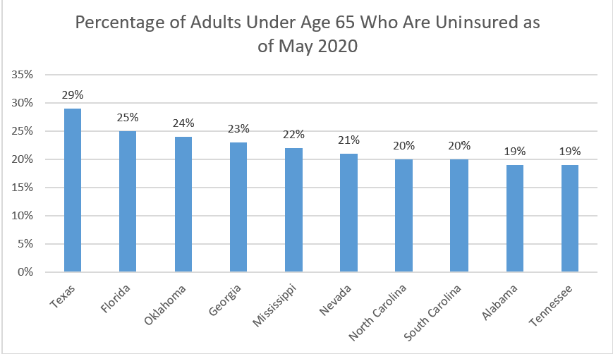 Of the top 10 states that hold the highest percentage of adults who have lost health insurance, half of the states are located in the south. Not surprisingly, many of these states had high unemployment rates during the same time period. Texas experienced a 13% unemployment rate in May 2020 while Nevada skyrocketed to a 25.3% unemployment rate.